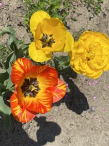 「周りの黄色に感化されて赤のチューリップが色変化している」